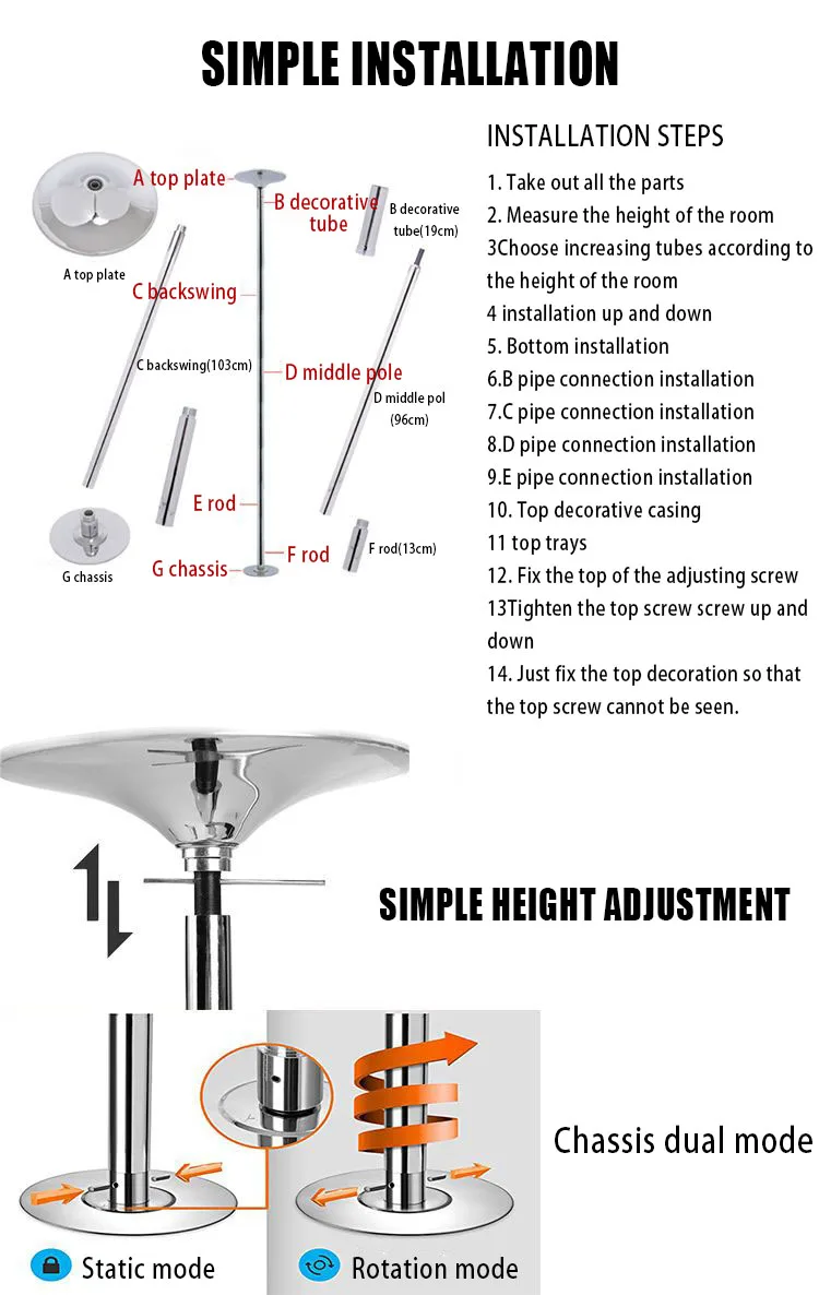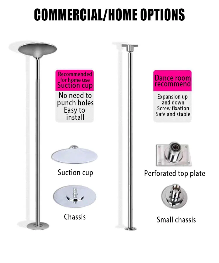 Applicable scenarios:Home/dance studio/gym/bar FIXED OR ROTATING : The hidden screw at the bottom of the base can switch between rotating mode and fixed mode. You can adjust the state of the dance pole to make it fixed or rotating, and easily install and remove the pole according to the instructions. The unique adjustment system can extend the rod and lock it in place without leaving the ground.
